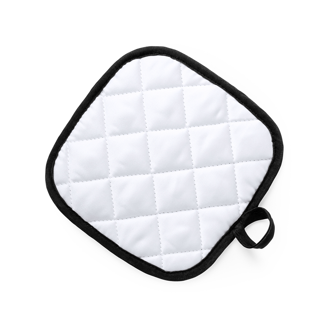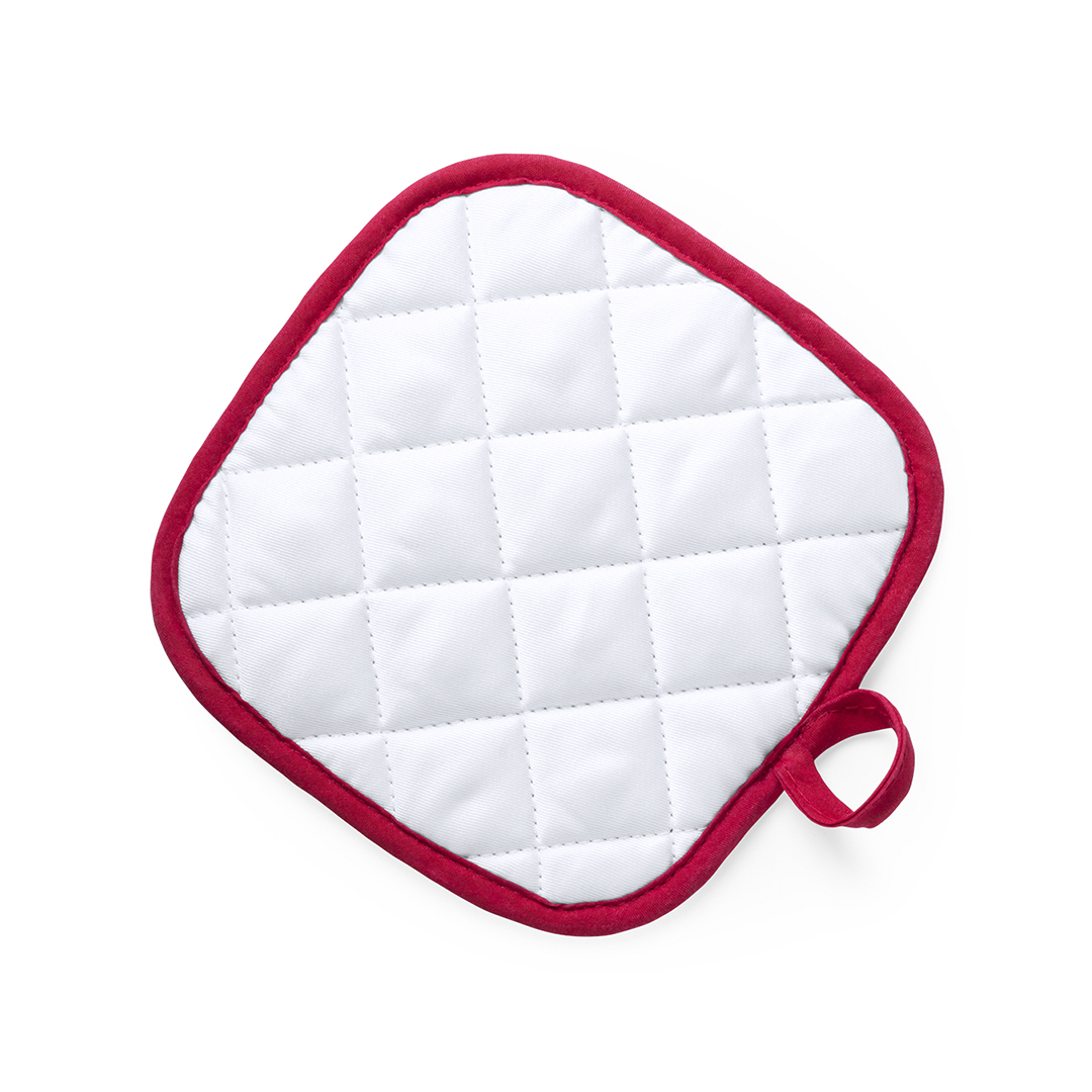 Weicher Topflappen aus 100 % Polyester in Weiß, mit Rändern in kräftigen Farben. Mit Schlaufe zum Aufhängen und einer glatten Seite – speziell für den Sublimationsdruck entwickelt.