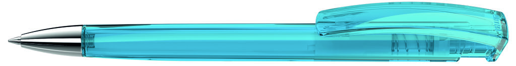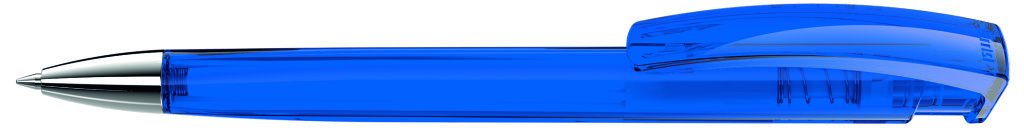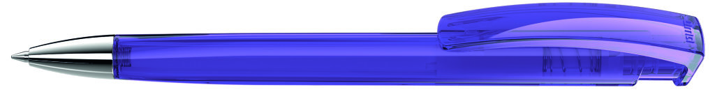 Druckkugelschreiber mit transparent glänzendem Dreikantgehäuse und schwerer Metallspitze glanzverchromt. Minenfarbe: blau