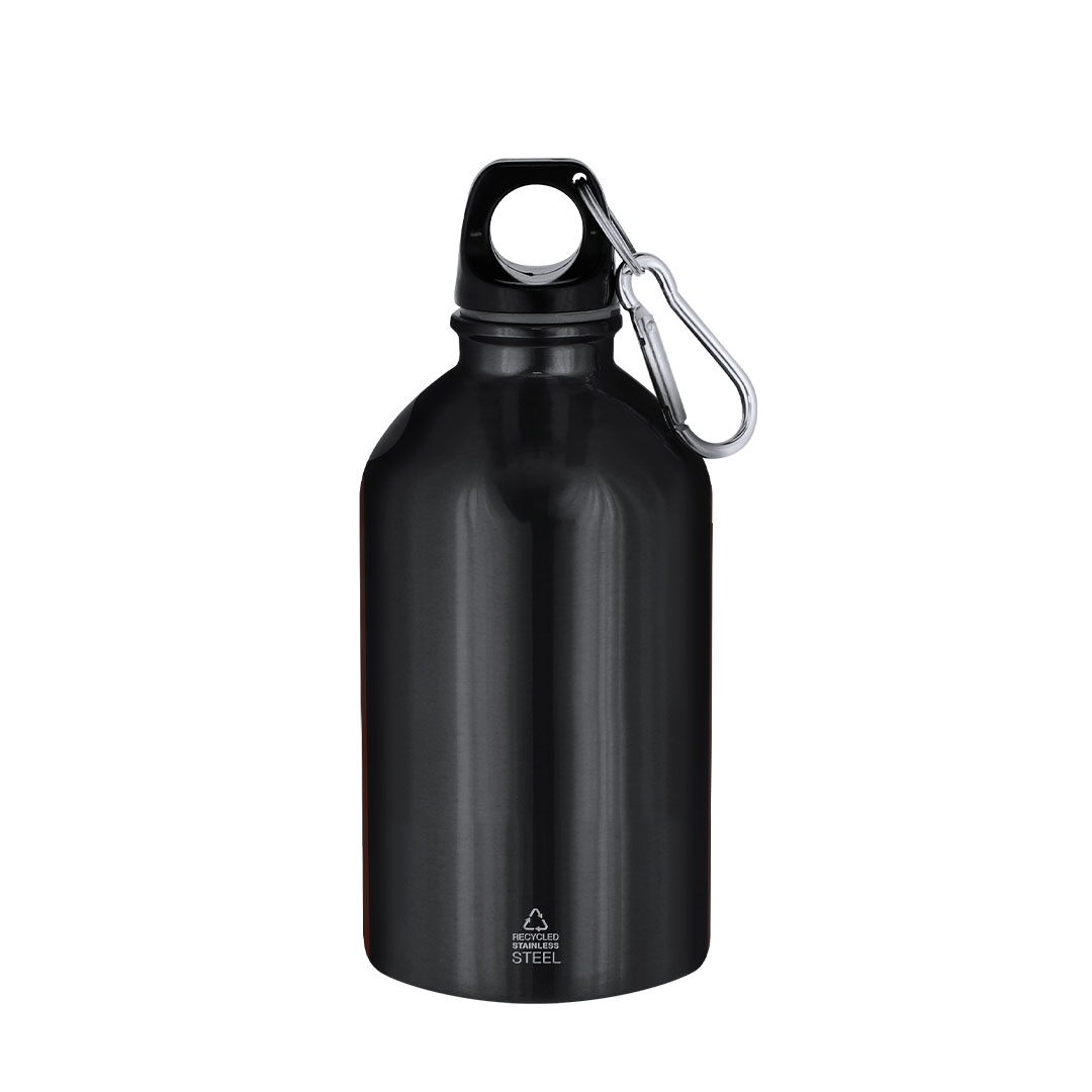 Trommel mit 500 ml Kapazität. Hergestellt aus recyceltem Edelstahl mit metallischer Oberfläche. Schwarzer Schraubverschlussdeckel, um eine optimale Abdichtung zu gewährleisten. Beinhaltet einen Metallkarabiner, der den Transport erleichtert. Mit recyceltem Edelstahl-Abzeichen.