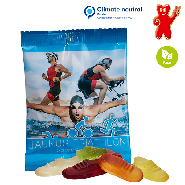 Fruchtgummi-Joggingschuhe ohne Gelatine, mit Aromen und färbenden Pflanzenauszügen, farblich und geschmacklich bunt gemischt, in glänzend- oder matt-kaschiertem transparentem alternativ weißem Werbetütchen verpackt.