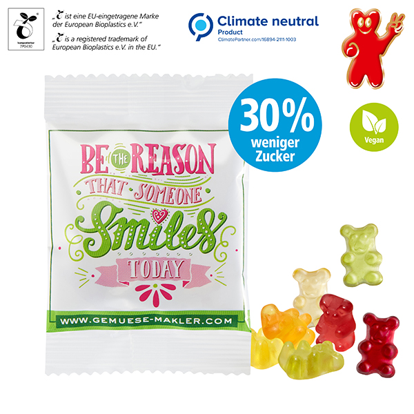 Fruchtgummi ohne Gelatine mit 30 % weniger Zucker, im Vergleich zu herkömmlichem Fruchtgummi, mit Aromen und färbenden Pflanzenauszügen, farblich und geschmacklich bunt gemischt, in transparentem alternativ weißem kompostierbarem Werbetütchen verpackt.