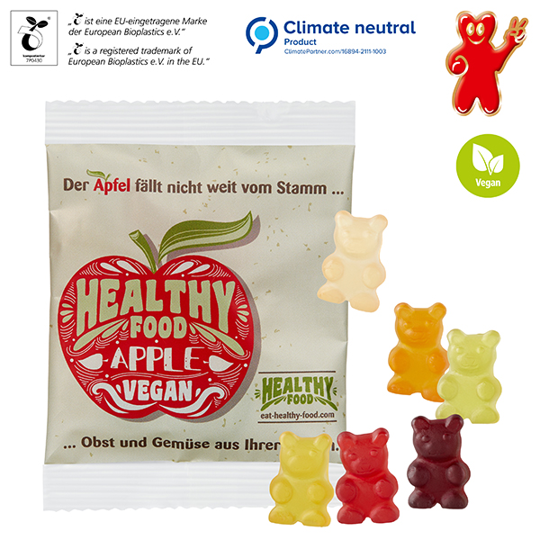 Vegane XXL-Bärchen ohne Gelatine, mit Aromen und färbenden Pflanzenauszügen, farblich und geschmacklich bunt gemischt, in transparentem alternativ weißem kompostierbarem Werbetütchen verpackt. Ab 300 kg sind alle Standardformen möglich.