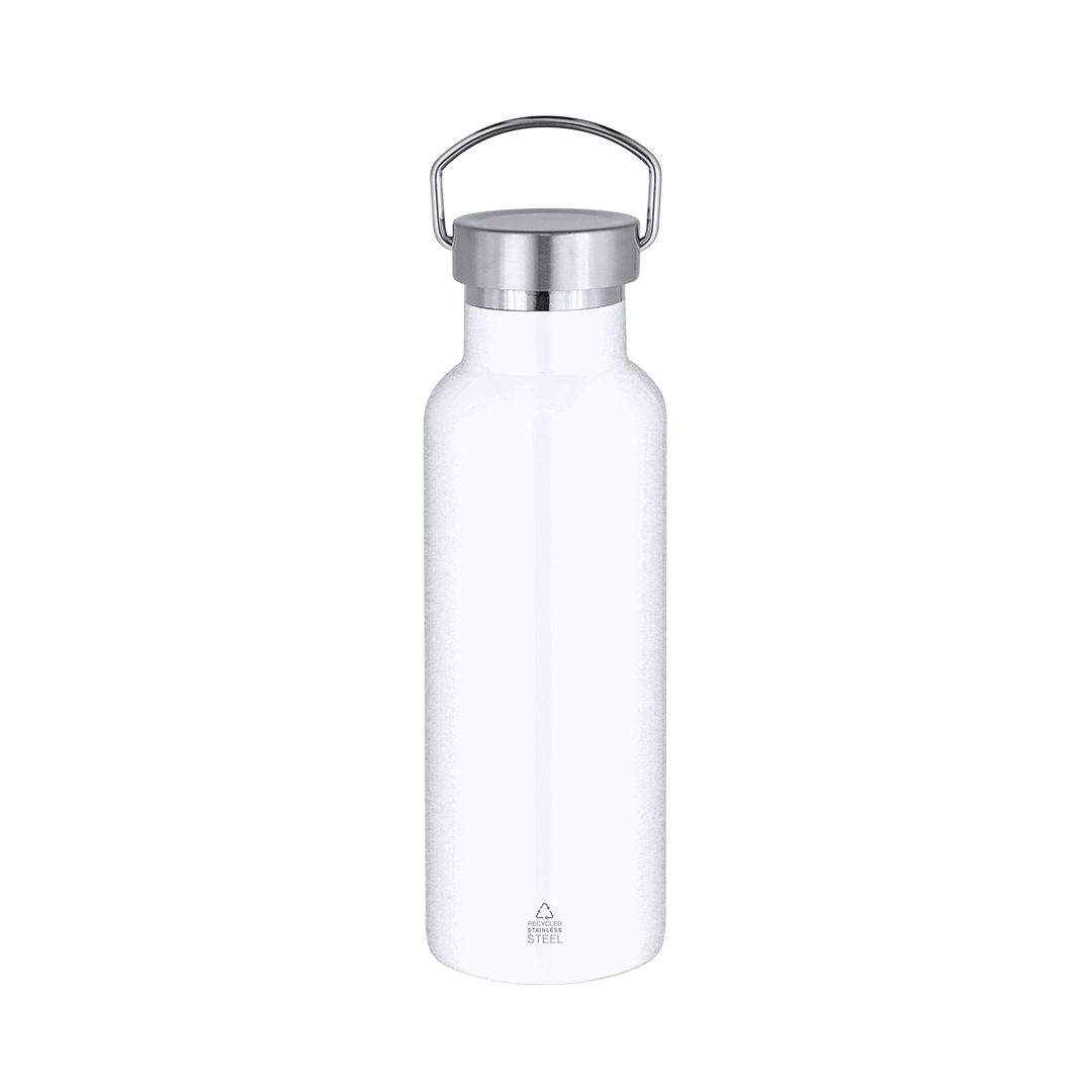 Isolierflasche aus doppelwandigem recyceltem Edelstahl mit 500 ml Fassungsvermögen. Mit lebendigen Farben und Metallic-Effekt. Schraubverschluss mit Tragegriff. Mit Emblem aus recyceltem Edelstahl. Stahl ist eines der gefragtesten Materialien und findet sich nahezu überall, von Alltagsprodukten bis hin zu großen Bauwerken. Mit zahlreichen Eigenschaften, insbesondere seiner Langlebigkeit und dem hohen Maß an Wiederverwendbarkeit, ist er eine sehr geschätzte Alternative für nachhaltige Lösungen. Richtig behandelt, ermöglicht er die Gewinnung neuer Ressourcen mit unendlicher Nutzung.