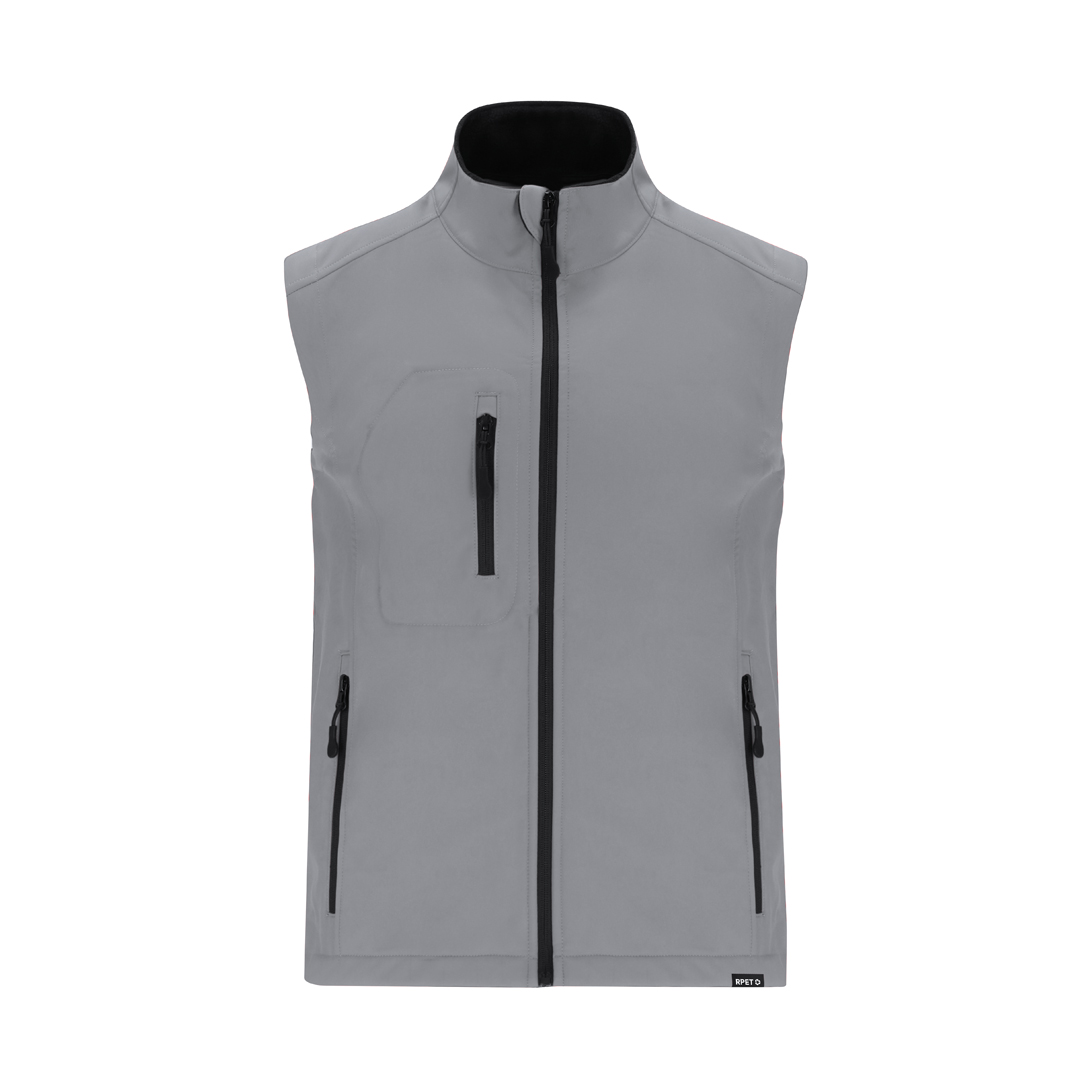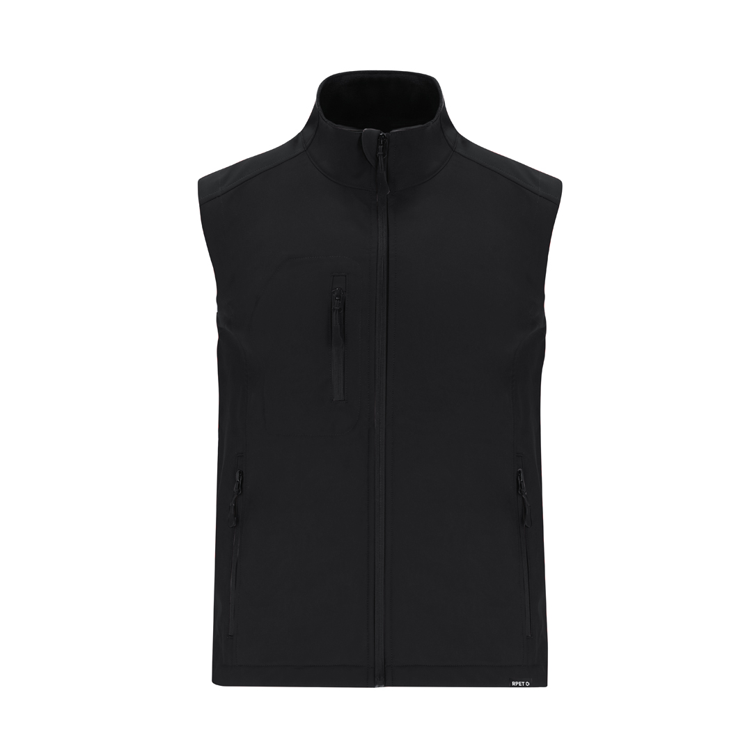 RPET Softshell-Westen aus 3 Schichten, 340 g/m². Mit 8000mm Membran, wasserdicht und atmungsaktiv. Außen Softshell und innen Mikrofleece in Schwarz. Mit Außentasche auf der rechten Brust und zwei seitlichen Reißverschlusstaschen. Mit Zentralreißverschluss und umgekehrten Reißverschlüssen an den Taschen, einschließlich schwarzer Zugbänder. Passender Kinnschutz und verstellbarer Bund mit elastischem Band und Stopper. RPET-Etikett am Saum des Kleidungsstücks.