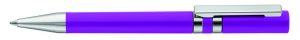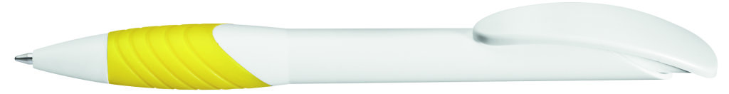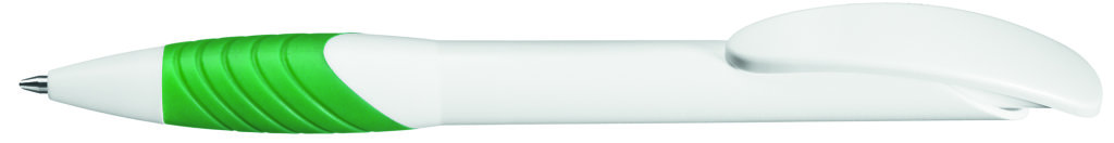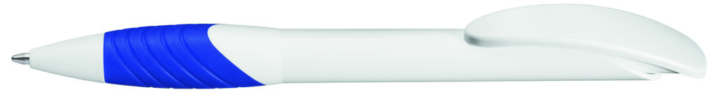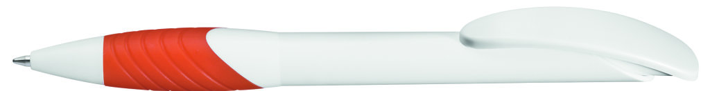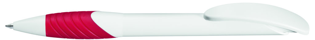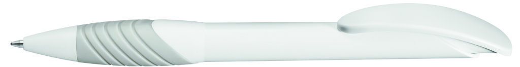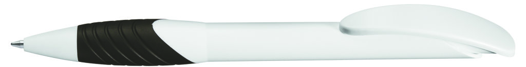 Druckkugelschreiber mit gedeckt mattem Gehäuse, Bogenclipdrücker und Spitze in weiß, ergonomische, farbige Gummigriffzone. Minenfarbe: schwarz