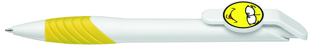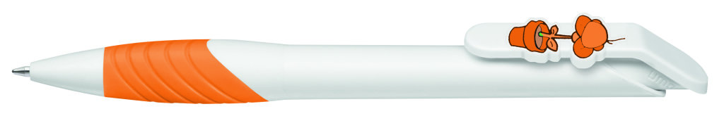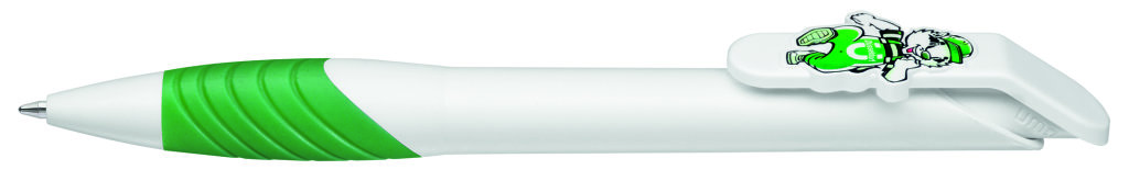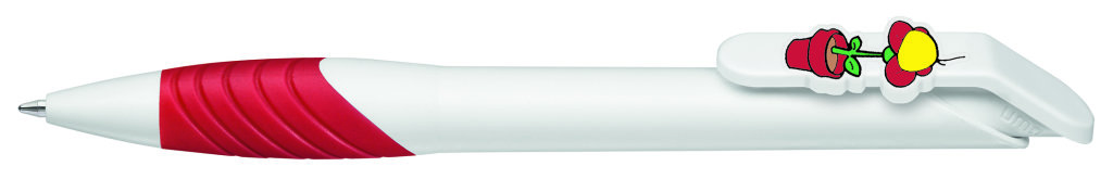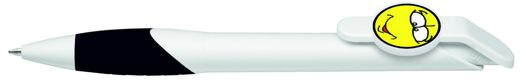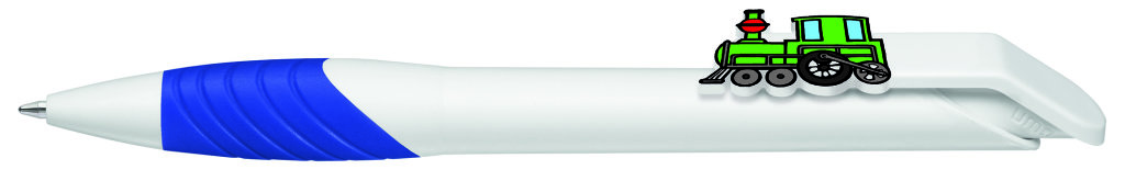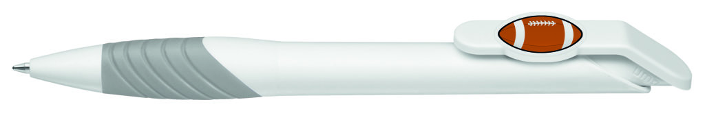 Druckkugelschreiber mit gedeckt mattem Gehäuse, individuell gestaltbarem Clipdrücker, Spitze und ergonomischer Gummigriffzone. Motivgröße nach Absprache, max.: ca. 30 x 20 x 2,2mm Minenfarbe: schwarz
