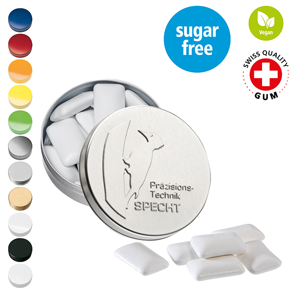 Metalldose aus 99 % recyclebarem Weißblech in 11 Farben und 10 verschiedenen Füllvarianten, wiederbefüllbar, einzeln gesleevt mit Aufreißhilfe.