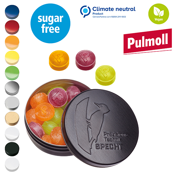 Metalldose aus 99 % recyclebarem Weißblech in 11 Farben und 10 verschiedenen Füllvarianten, wiederbefüllbar, einzeln gesleevt mit Aufreißhilfe.