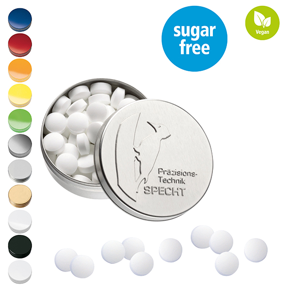 Metalldose aus 99 % recyclebarem Weißblech in 11 Farben und 10 verschiedenen Füllvarianten, wiederbefüllbar, einzeln gesleevt mit Aufreißhilfe.
