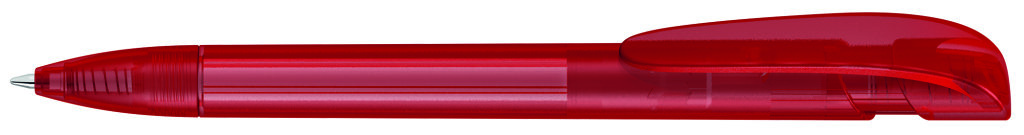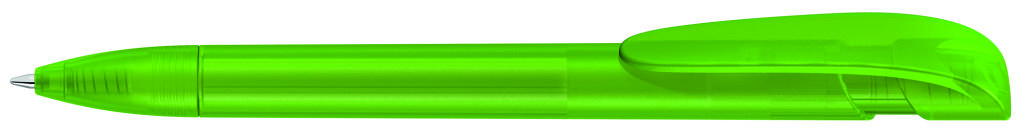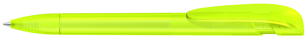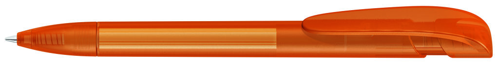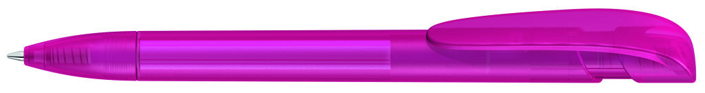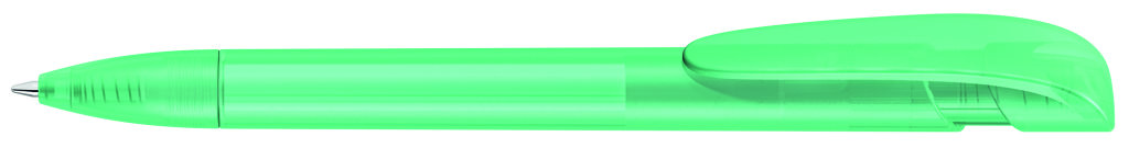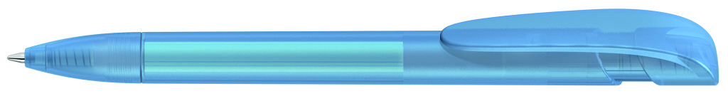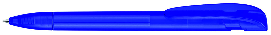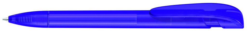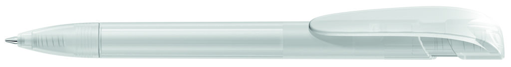 Druckkugelschreiber mit transparent gefrostetem Gehäuse, breitem Bogenclipdrücker und Spitze. Minenfarbe: blau