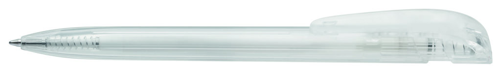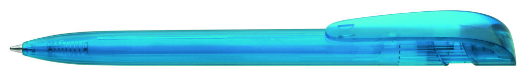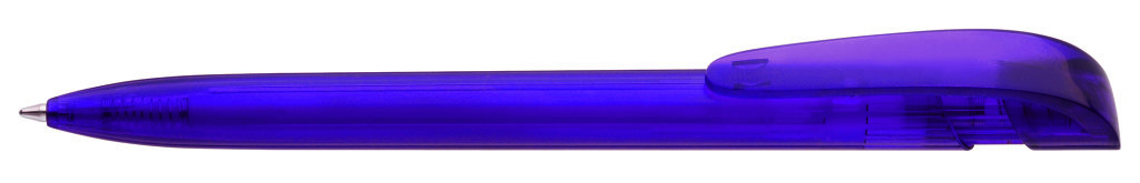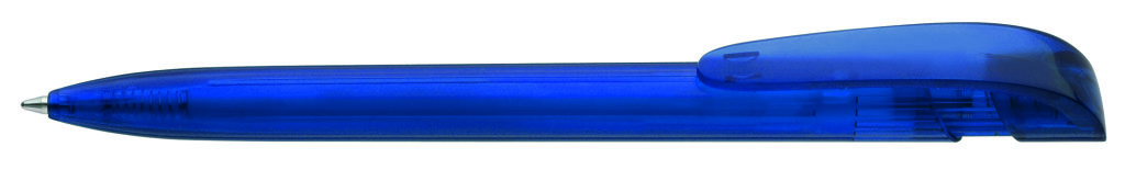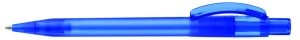 Druckkugelschreiber mit transparent glänzendem Gehäuse und breitem Bogenclipdrücker. Minenfarbe: blau