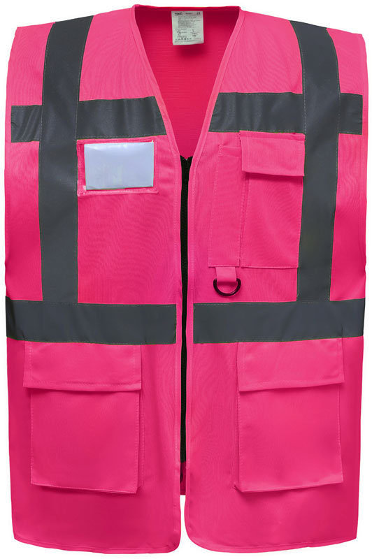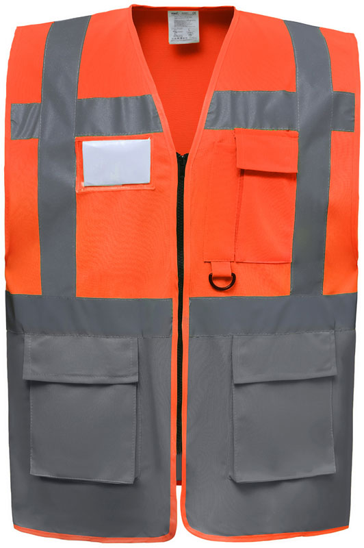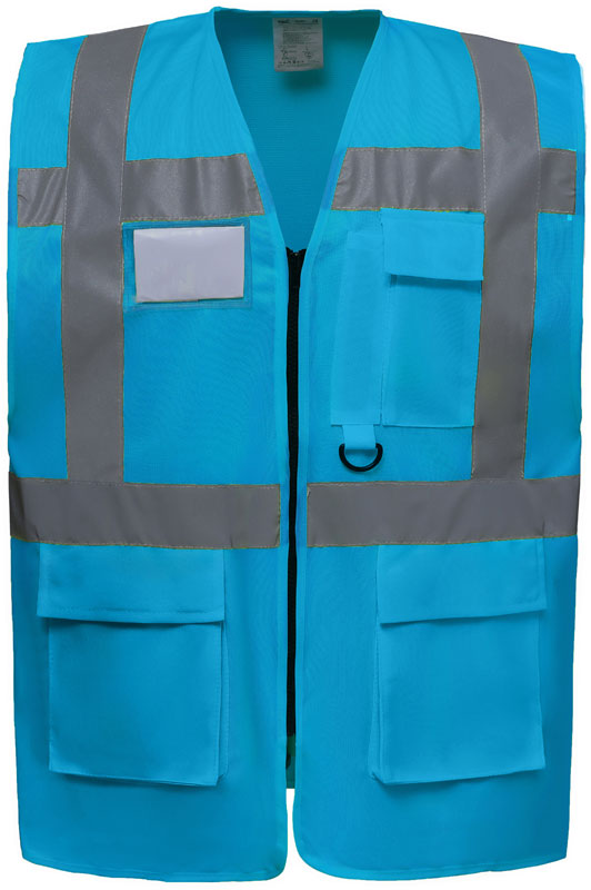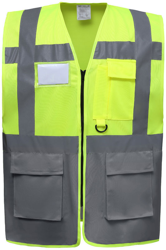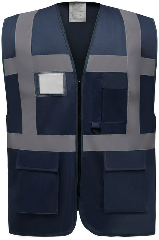 Hi-Vis Multifunktionsweste, Durchgehender Reißverschluss, 2 Seitentaschen mit Klappen, aufgesetzte Brusttasche links, integrierter Stiftehalter, Ring zum Befestigen von Karte, Schlüssel, etc., Hi-Vis Farben zertifiziert nach EN ISO 20471 Klasse 2, Farben mit hi-vis yellow oder orange und einer zweiten Farben zertifziert nach EN ISO 20471:2013 Klasse 2, sonstige Farben ermöglichen erhöhte Sichtbarkeit, garantierte Reflektionseigenschaft gemäß EN-Norm für 25 Waschgänge, große Veredelungsfläche am Rücken, je 1 Reflexstreifen über jeder Schulter, zwei 5cm breite Reflexstreifen um den Körper, 40° waschbar, Material: 120g/m², 100% recyceltes Polyester, Größen: S,M,L,XL,XXL,3XL,4XL,5XL,6XL